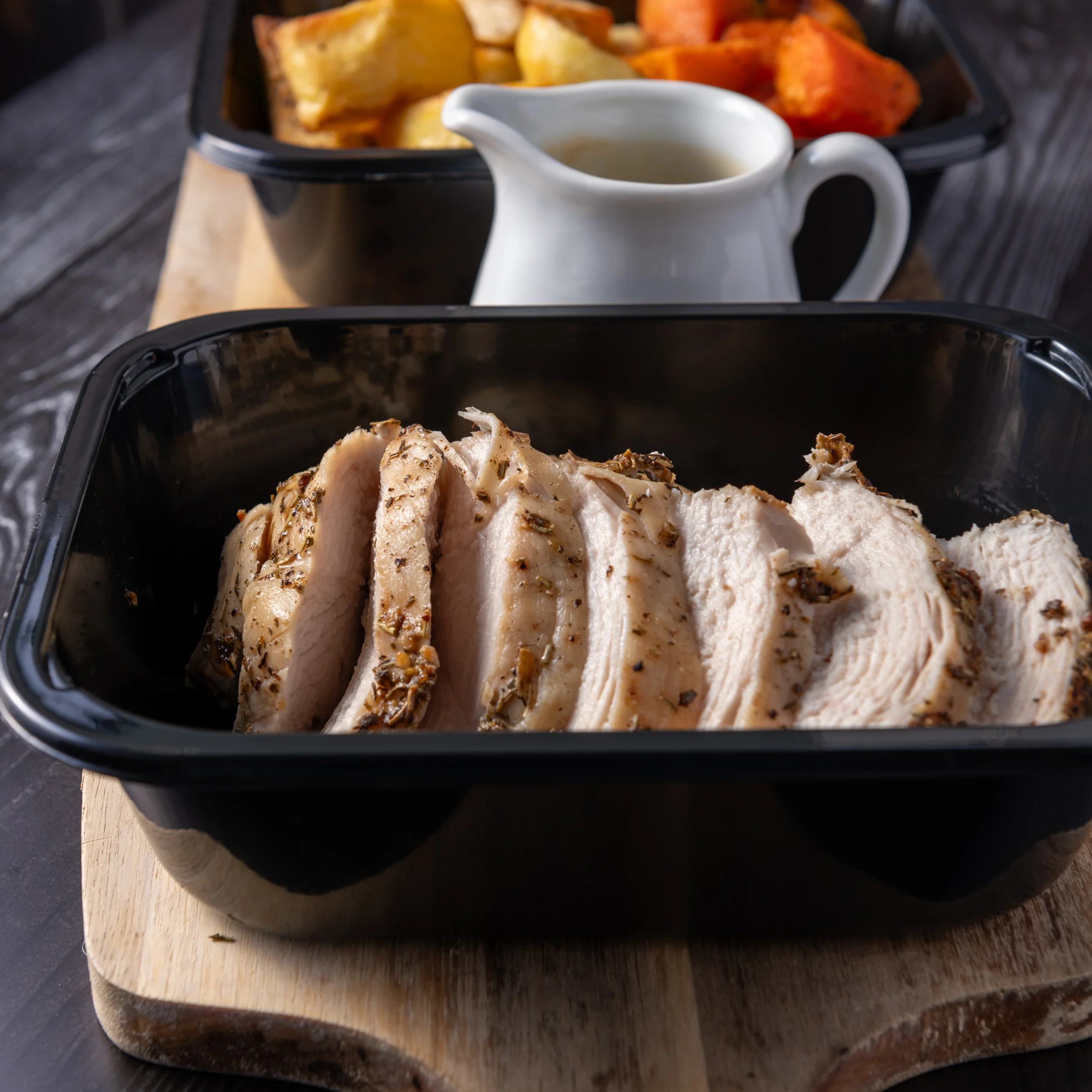 Chicken breast, salt, pepper, dried herbs, garlic, seasonal roast vegetables, gravy.