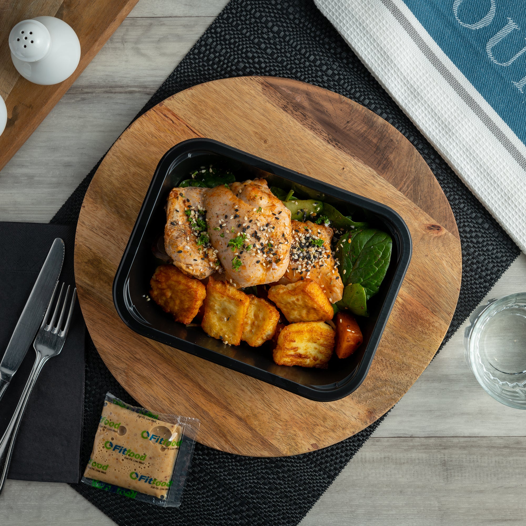 Tender chicken thigh with aromatic garlic and herbs, served with roasted carrots in a North African red pepper spice, with fresh cucumber and halloumi. Comes with 30g pomegranate dressing.