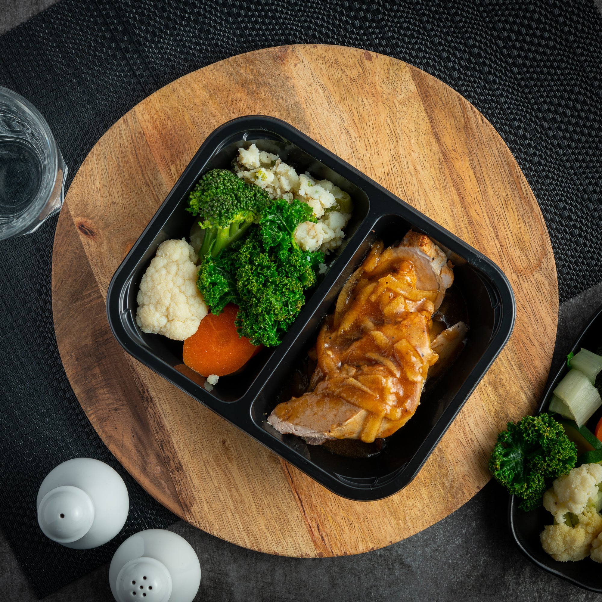 Roasted pork fillet, served with crushed new potatoes, seasonal steamed vegetables and jus.