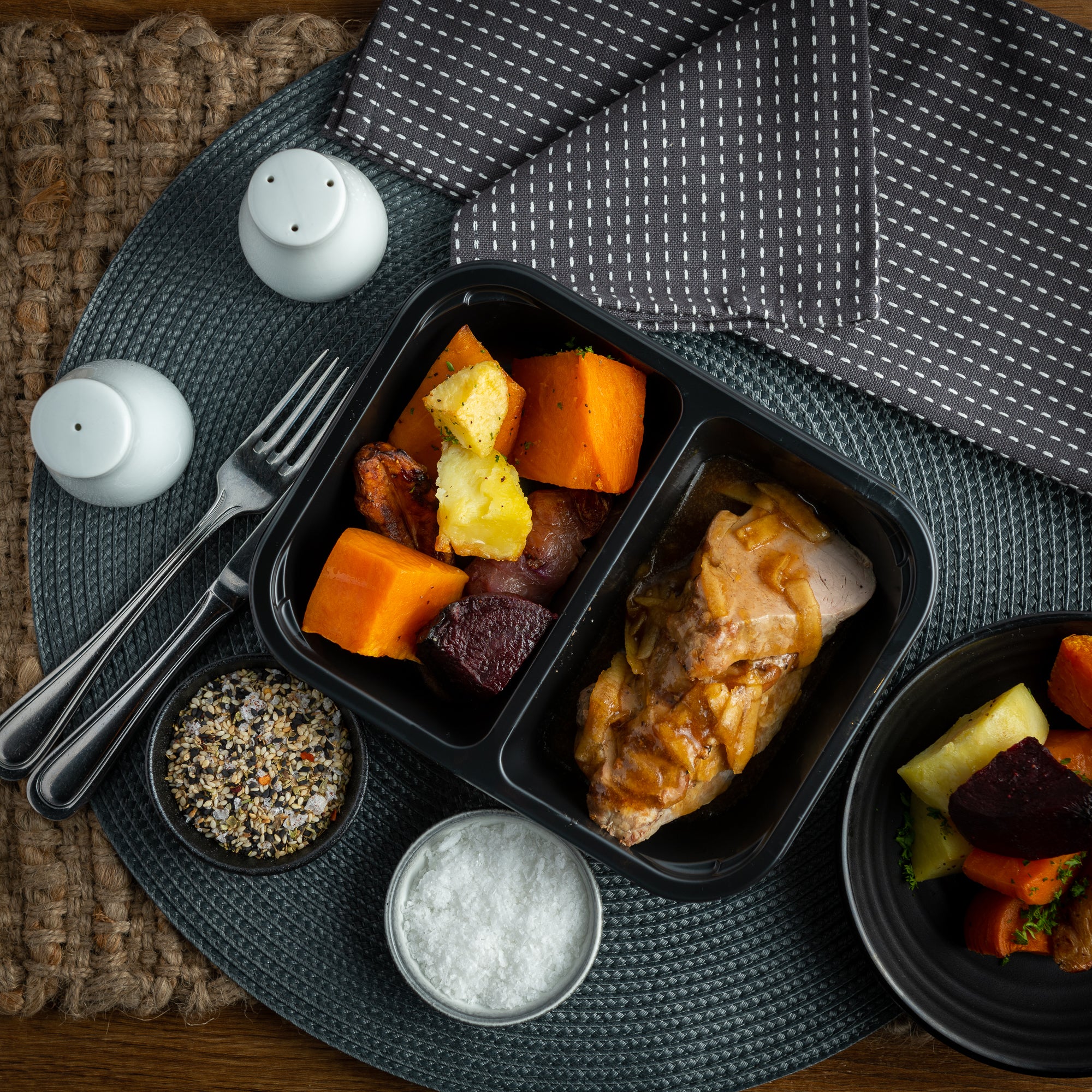 Roasted pork fillet, served with roasted seasonal vegetables, finished with jus.