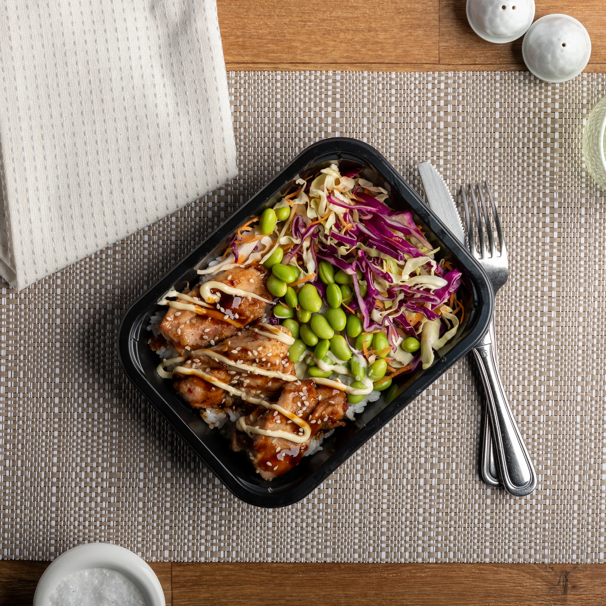 Tender juicy chicken with savoury, sweet and umami teriyaki sauce, served on a bed of warmed rice and Japanese sauces, alongside edamame beans and slaw.